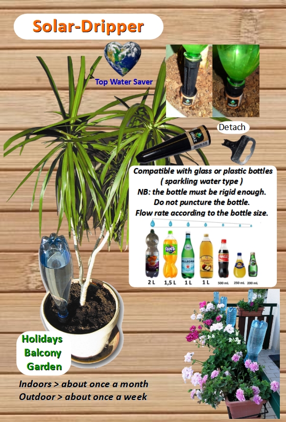 The Solar-Dripper ® uses temperature variation to generate drips according to the weather conditions. It does not need electricity because thermal change naturally triggers the flow. The watering rate of the solar-driper varies depending on the size of the bottle used and its filling rate. The usual filling is 75%. You can slow the flow by filling the bottle to 90 % or accelerate it by filling it to 50 %. The volume of captive air in the bottle reacts to the heat of the sun by expanding and contracting when the temperature drops. Those dilation–contraction cycles trigger drops and aspiration of air bubbles.